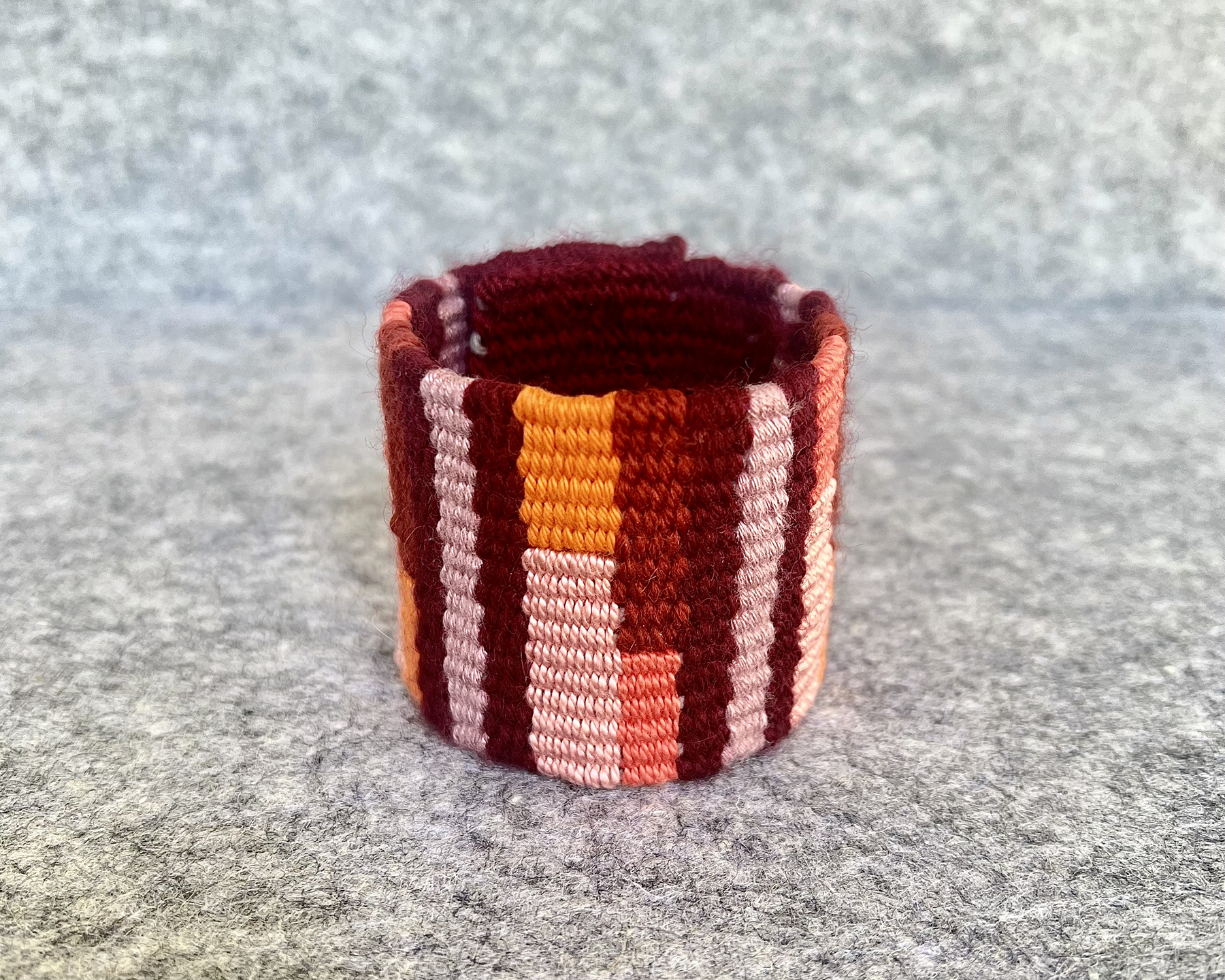 My Design Process: I love playing with color so I always start a new weaving project with color inspiration. I mix and match colors from my yarn stash until I find a combination of colors and textures that excites me. Next, I draft a new bracelet or wall hanging pattern in Adobe Illustrator. The weaving design or pattern is often determined by the color relationships I want to highlight. I love to mix muted tones and rich dark shades with saturated hues. I arrange the colors so each color dynamically contrasts or harmoniously blends with neighboring colors.