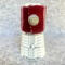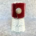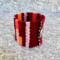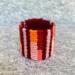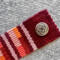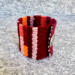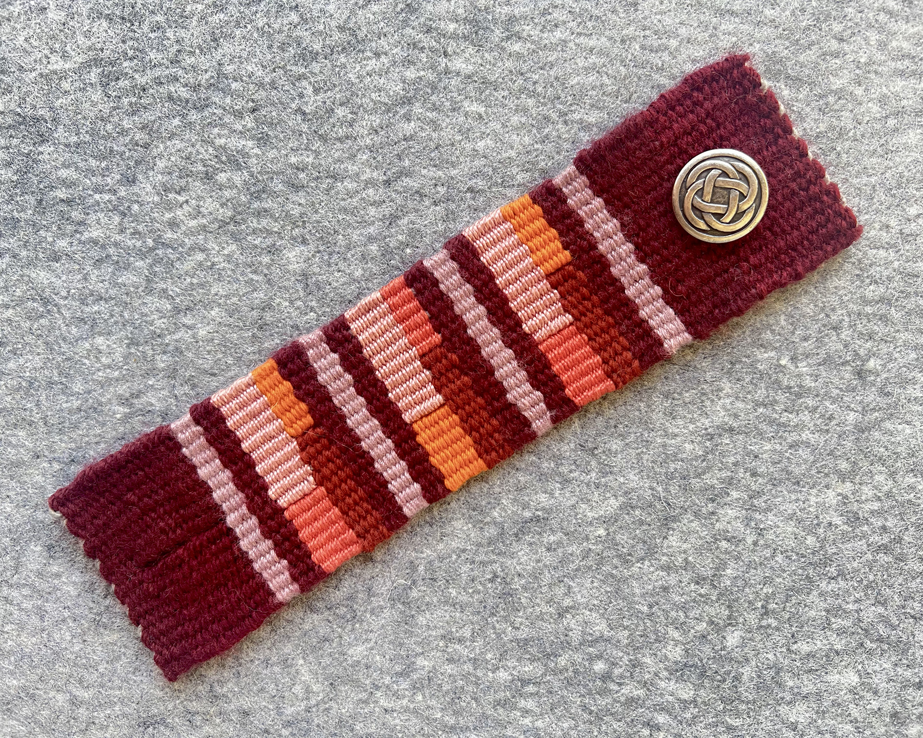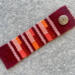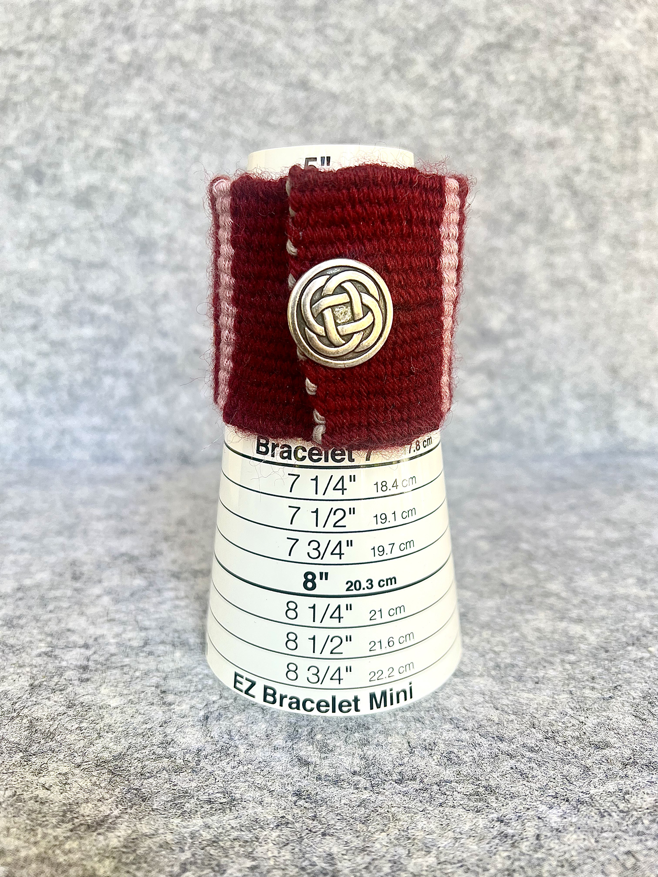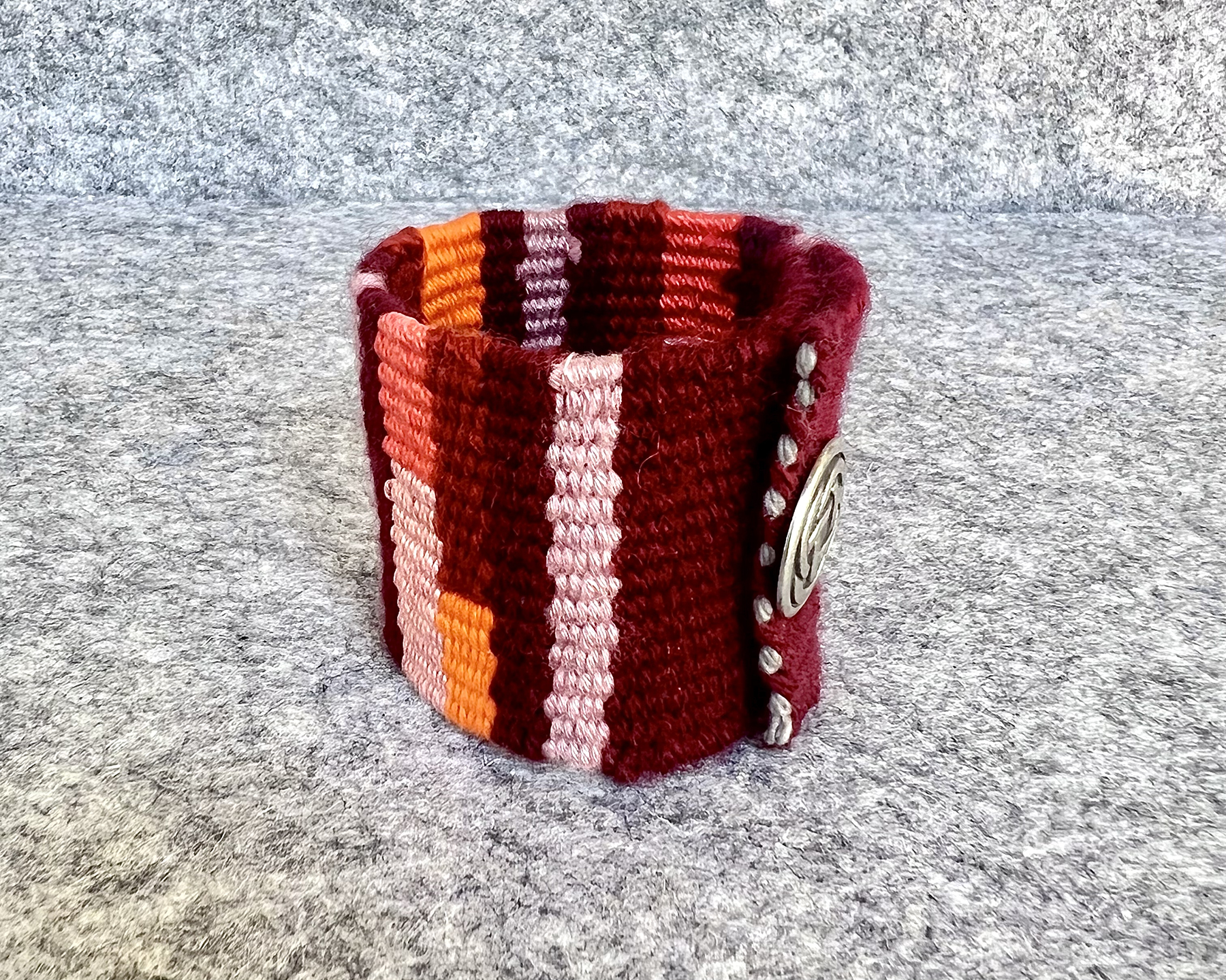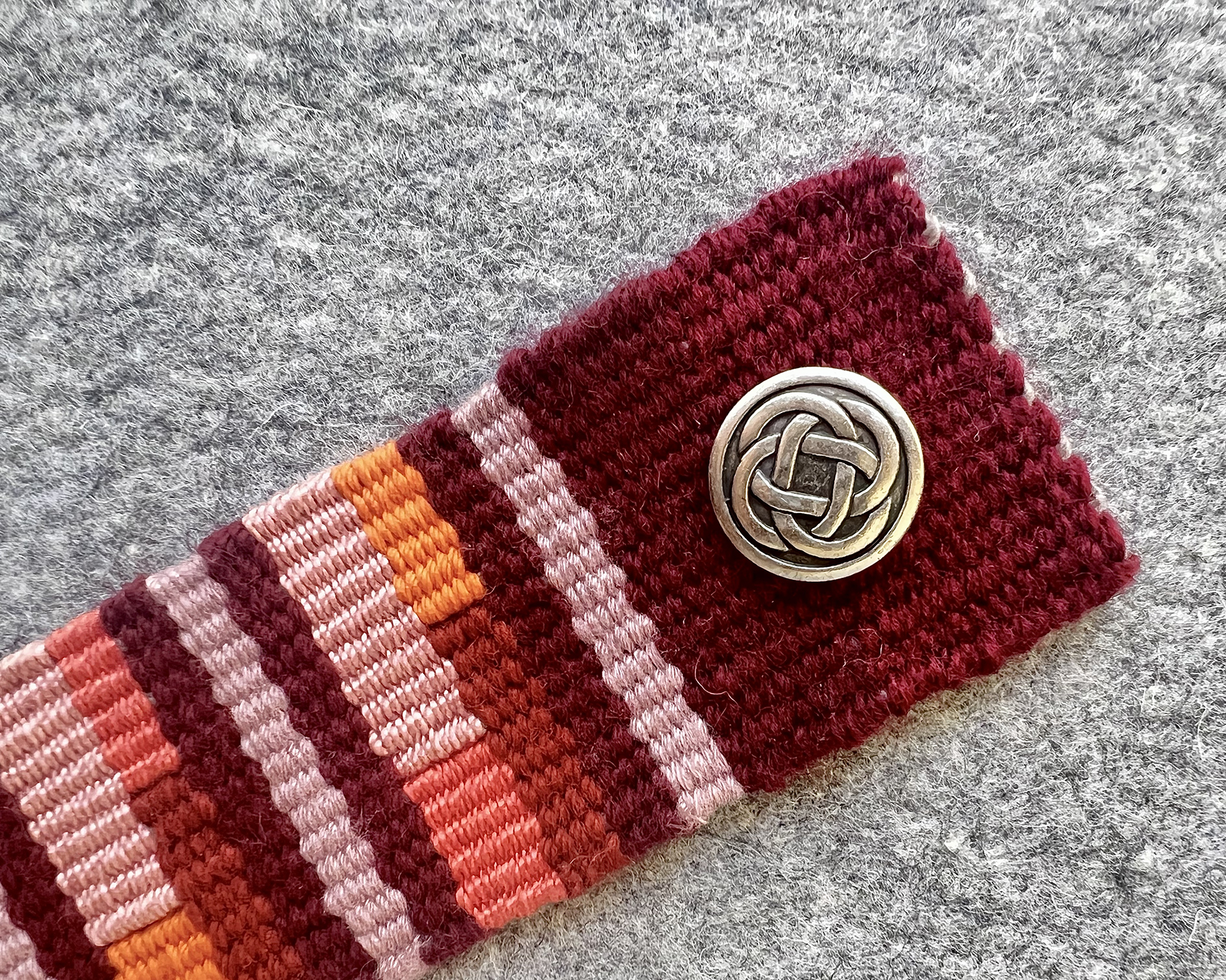 This bright bold multicolor bracelet is hand woven with DMC 100% cotton thread, shimmery pearlized cotton thread and wool yarn, along with silky bamboo rayon yarn. It features an earthy autumn color palette of deep burgundy, copper brown, yellow orange, coral and blush pink, and lavender gray woven into a mosaic geometric pattern design. It is 2.25 inches wide with a circumference of approximately 7.25 inches. The ends attach with a decorative antique silver button with an embossed Celtic knot motif.