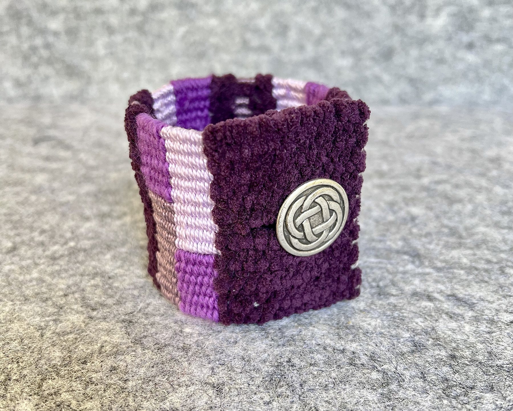 This yarn bracelet is woven with soft plush chenille, pearlized cotton thread and wool yarn in a bold geometric mosaic pattern. Colors include rich jewel tones of deep purple, red violet, lavender pink and lavender gray. It is 2.25 inches wide with a circumference of approximately 7 inches. The ends attach with a decorative antique silver button with an engraved celtic motif design.